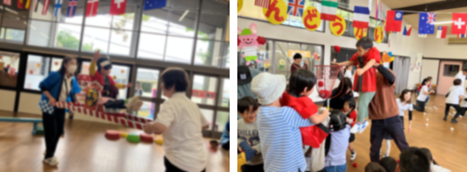 くま組、ぱんだ組の「うんどうかい」を「あすなろ館」で行いました。 くま組のこども達は『おみこしわっしょい!!みんなでおまつりにでかけよう!』では、いろんな屋台をめぐり最後はお神輿にのってわっしょい♪わっしょい♪をしました。 ぱんだ組のこども達は『ドキドキワクワクアニマルワールド!』様々な動物に会いに Let‘sJungle!!。 こども達、保護者の皆様、保育士みんなで玉入れをし、体操しました。 こども達の成長を手に取るように感じた大切な時間となりました。